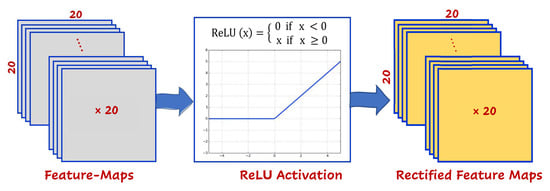 (2). Feature activation with the Rectified Linear Unit (ReLU) function: This module is responsible for activating all units of the feature maps with a non-linear rectification function known as the ReLU. The ReLU function is MAX(X,0) that sets all negative values in the matrix X to zero, while all other values are kept constant. The reason for using ReLU is that training a deep network with ReLU tends to converge much more quickly and reliably than training a deep network with other non-linear activation functions, such sigmoid or tanh activation functions []. Figure 11 illustrates the rectification layer of the convolved maps.