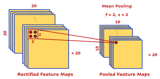 (3). Down-sampling with a pooling operations layer: This module is responsible for generating new matrices called pooled feature maps that reduce the spatial size of the rectified feature maps and thus reduce the number of parameters and computational complexity in the network []. This can be done by combining the neighboring points of a particular region of the matrix representation into a single value that represents the selected region. The adjacent points are typically selected from a fixed-size square matrix (determined according to the application). Among these points of the applied matrix, one value is nominated as the maximum or mean of the selected points. In this research, we used the mean pooling technique to develop the pooling layer since it combines the contribution of neighboring points instead of only selecting the maximum point. To produce the pooled-feature maps , the pooling filter was independently applied over the rectified feature maps with stride , as follows: