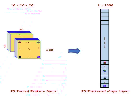 In this research, since we had 20 pooled feature maps (), each with dimensions of 10 × 10 (, then our flatten layer comprised 2000 nodes. Figure 13 illustrates the flattening layer development of our CNN.