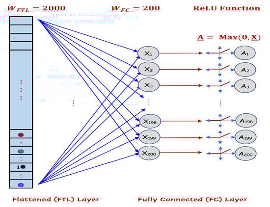 (2). Fully connected (FC) layer with the ReLU function: FC layers, as the name implies, are those layers where all the inputs from one layer are connected to every activation unit of the next layer []. Commonly, FC layers are located as the last few layers of any CNN. Therefore, this module is responsible for compiling the high-level features extracted by previous layers (convolutional and pooling layers) into a reduced form of low-level features in which they can be used by the classifier located at the output layer to provide classification probabilities. In this research, we developed an FC layer with 200 neurons connected with 2000 nodes of the flattened (FLT) layer, which provided a layer complexity reduction of 10:1. As the inputs pass from the units of the FTL layer through the neurons of the FC layer, their values are multiplied by the weights and then pass into the employed activation function (normally the ReLU function), just in the same way as in a classical NN (i.e., a shallow NN). Thereafter, they are forwarded to the output classification layer, where each neuron expresses a class label. Note that, the FC layer also goes through a backpropagation [] process to determine the most accurate values of its trainable parameters (weights ). Figure 14 illustrates the development of the FC layer of our CNN.