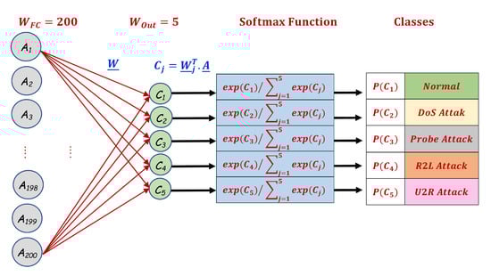(3). Output layer with the softmax function: This module is responsible for providing/predicting the correct classification for each evaluated sample record of the utilized IoT attacks dataset. Here, we provided two types of classification, namely, the binary classifier (normal or anomaly) and the multiclassifier (normal, DoS, probe, R2L, U2R). The data points received from the 200 neurons of the FC layer () were fully connected with the five neurons () of the output classes (j = 5 vectors) through the transposed weight connections (). This is illustrated in Figure 15 and can be achieved algebraically as follows: