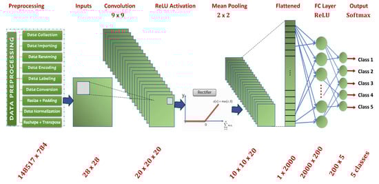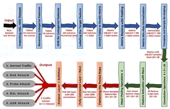 Moreover, the life cycle for the packet traffic received at the IoT gateway is provided in Figure 17 below. The input layer took the encoded features generated from the FE subsystem in order to be trained at the CNN, which updated the training parameters and generated the least cost/loss value (error) with optimal accuracy. The output layer employed the softmax classifier, which was used to classify the data using two classification techniques, namely, the binary classification technique, which provided two categories (normal vs. anomaly), and the multiclassification technique, which provided five categories (normal, DoS attack, probe attack, R2L attack, U2R attack).