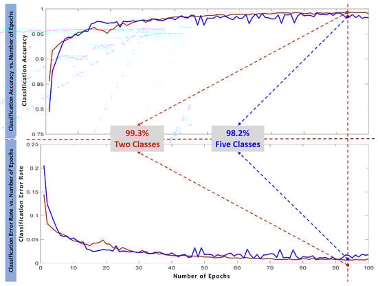 The plot for the overall testing classification accuracy and overall classification loss (classification error) that compares the performance of the binary classifier (two classes) and the multiclassifier (five classes) obtained during the validation process of the NSL-KDD dataset are illustrated in Figure 18. According to the figure, at the beginning and after one complete pass (epoch) of the testing process, both classifiers showed relatively low classification accuracy proportions with 85% and 79% registered for the two-class classifier and five-class classifier, respectively. Thereafter, both classification accuracy curves began to roughly increase with a stable tendency, while the testing epochs proceeded with faster and higher ceiling levels obtained for the classification accuracy of the two-class classifier. After training the system for 100 epochs, the system was able to record overall testing accuracy proportions of 99.3% and 98.2% for the two-class classifier and five-class classifier, respectively, for the given test dataset samples. Conversely, it can be clearly seen that both classifiers showed relatively high classification error proportions at the beginning of the testing process, with 15% and 21% registered for the two-class classifier and five-class classifier after one testing epoch, respectively. Thereafter, both classification error rates started to systematically decline, while the binary classifier progressed faster, achieving a 0.7% incorrect prediction proportion (classification error percentage). However, the classification error rate proportion for the multiclassifier was saturated with less than 2.0% of incorrect predictions. This range of classification error of both classifiers (0.7–1.8%) was permitted to avoid underfitting or overfitting from the training loss (≈0.0%) and training accuracy (≈100%), and thus provided high-accuracy classification performance.