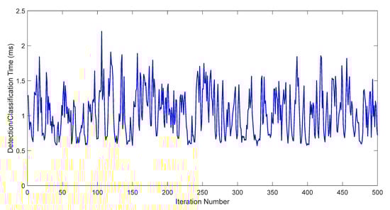 Moreover, we analyzed the time required to perform the attack detection or classification for one IoT traffic sample. To obtain accurate and precise results, we ran the validation test 500 times and then computed the time statistics for the detection and classification. Figure 19 shows the detection/classification time performance for the proposed model (either two-class or five-class classifier). According to the figure, the time required to detect/classify one sample record ranged from min = 0.5662 ms to max = 2.099 ms with an average time of mean = 0.9439 ms recorded for the 500 simulation runs. This average time (around 1 ms) is very useful for the system to run in a dynamic environment, such as for real-time IDS applications.