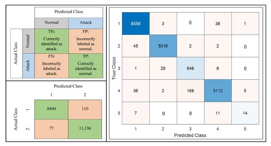 Furthermore, even though the classification accuracy measurement is the key factor used to evaluate the efficiency of the classification or detection system, we evaluated the validation (testing) dataset using a confusion matrix [] with a clear identification of the true positive (TP), true negative (TN), false positive (FP), and false negative (FN) analysis to provide more insight about the performance of the proposed system. Figure 20 shows the general confusion matrix of our system, confusion matrix results for the two-class classifier using the testing dataset and the confusion matrix results for the five-class classifier using the testing dataset.
