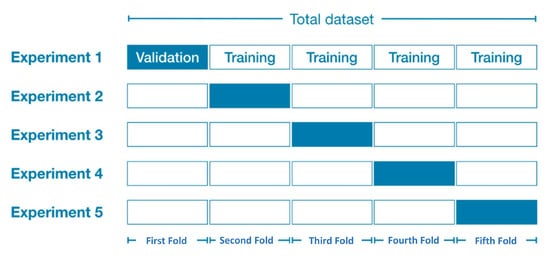 To validate the proficiency of the proposed system in compliance with the system’s purpose and specifications and to ensure a high level of reliability of our system’s validation stage, we conducted a five-fold cross-validation process [] that encompassed five different experiments for each classification model (total of 10 experiments) with different sets for training (≈128,000 samples) and validation (20,000 samples) nominated for each experiment, as demonstrated in Figure 21, which shows the distribution of the dataset across the folds for each conducted experiment.