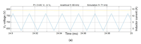 The required switching frequency in QSW-ZVS for each power can be analytically or graphically estimated using [14]. However, the frequency is automatically achieved using the event-based strategy. In Figure 11, two simulation results examples show the accuracy of the proposed method. Slight mismatch is mainly due to differences of the minimum value of the IL given during the resonant period. A good agreement with experimental results is also obtained (see Figure 16c).