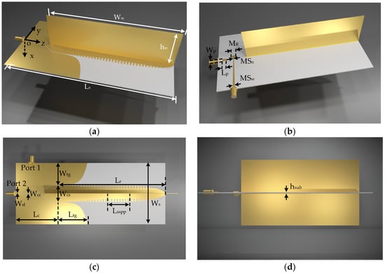 The configuration of the proposed monopulse antenna is depicted in Figure 1. For showing the detailed structure, the front side view, back side view, top view, and the side view are provided. The monopulse antenna is composed of an SSPP transmission line fed by a coplanar waveguide port and a microstrip line port. The SSPP, with corrugated grooves along both sides, supports the slow wave mode and confines the energy near its metal and dielectric interface. A gradually narrowing termination is adopted at the end of the SSPP structure for matching with the free space and releasing the confined energy to the space. A metal plate is installed in the middle of the SSPP structure, and thus, the interrelation between the SSPP modes along both sides would be diminished.