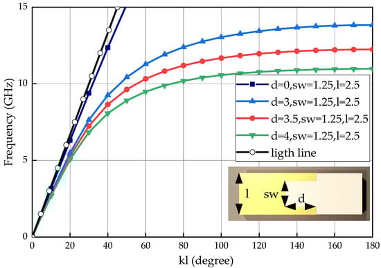 The SSPP mode is an electromagnetic field distribution along the interface of metal and dielectric mediums. The phase velocity for the SSPP mode is slower than that for the light propagating in the vacuum. Due to the structure along the interface, the field is confined closely near to it and transmits along the SSPP. The corrugated grooves, with different periods, depths, and gap widths, could be utilized for enhancing the field confinement. Meanwhile, due to this field confinement, the effective permittivity of this SSPP transmission line is altered and varies with the operating frequency. For the high frequency, due to the increased energy proportion in the substrate, the effective permittivity adds nonlinearly with the frequency. This also leads to the decrease of the propagation velocity, which can be inferred from the dispersion curves shown in Figure 2. The dispersion curves are obtained in the CST Microwave studio by using the eigenmode solver. For the periodic grooves with greater depth, the dispersion effect becomes obvious, and the cutoff frequency decreases quickly. The change of the cutoff frequency, resulting from the corrugated grooves, limits the operating frequency range for the proposed monopulse antenna.