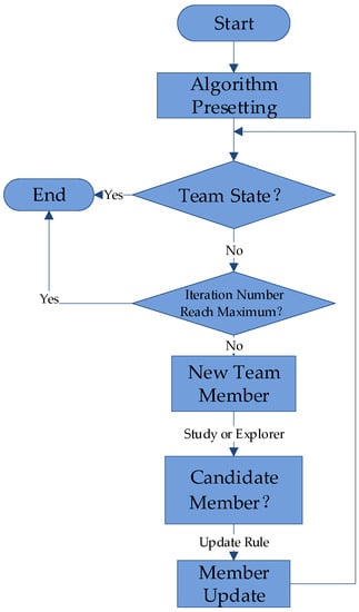 Optimization of the reflection coefficient is of great significance for the proposed antenna because quantities of variables have the influence on the reflection coefficient, including the dimensions of the feeding structure and the SSPP radiating structure. Many optimization methods have been widely adopted in antenna and microwave component designing scenarios, including electromagnetic band-gap [23], spatial phase shifters [24], frequency selective surface, and array synthesis [25,26,27]. Among the algorithms, the team progress algorithm (TPA) is suitable for the optimization of the proposed antenna, which is an intelligent optimization algorithm that simulates a team upgrading process with member learning, exploring, and renewal, and it has the abilities of global, local, and directional search [28].