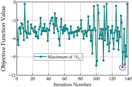 For the proposed antenna, the field distribution and the radiated sum and difference beams are basically determined by the SSPP and the feeding modes, which have been described in Section 2.2 and Section 2.3 and can be designed theoretically. The port matching performance is optimized by the TPA, and the convergence result for the sum port is shown in Figure 4. In this optimization, the maximum iteration number is set as 140, including 40 team members served in the elitist group and the plain group. According to the result in Figure 4, the optimization procedure converges quickly after the initialization of the elitist group and the plain group. TPA is a global optimization algorithm, and it could search the optimum in the entire space. With the increase of the iteration, the percentage of “good” performance increases constantly. Meanwhile, the TPA keeps searching in the entire space, trying to avoid the local optimum. This leads to the scattered samples in the iteration optimization procedure, as shown in Figure 4. A maximum reflection coefficient of −10.68 dB in the frequency range from 5.0 GHz to 7.5 GHz is obtained at the 133rd calculation.