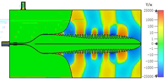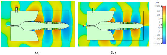 The variation of directivity reflects the significance of dimension design for the antenna. The directivity of the antenna is influenced by the phase distribution on the aperture of the antenna. The phase distribution depends mainly on the phase difference between the power propagating on the SSPP structure and the power leaked into free space by the slot–SSPP transition structure. The field is confined in a closer range to the conductor of the SSPP, and at the terminal section, electromagnetic field is released. Meanwhile, the field leaked by the slot–SSPP transition structure is at a distance from the conductor, as is shown in Figure 5. As is depicted in Figure 2, the phase constant of the SSPP increases rapidly with the growth of frequency, while the phase constant of waves propagating in the free space is a constant. According to [30], nonuniform phase distribution will result in a directivity drop due to the field addition that is formed in the far-field region: