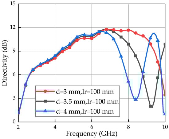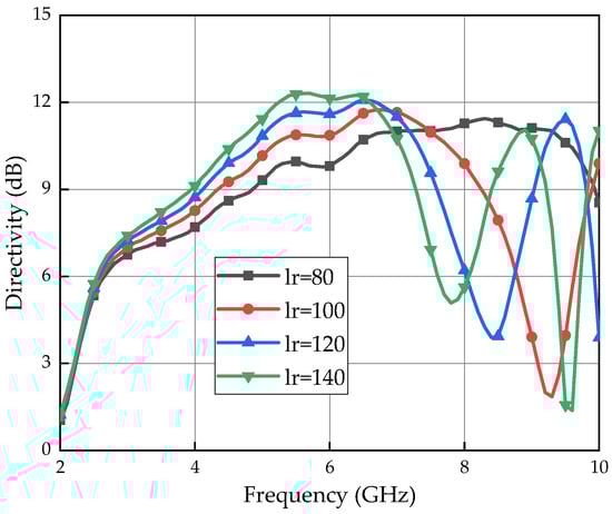 where Δk(f) is the difference of phase constant, n is the unit cell number of the SSPP structure, l is the length of the SSPP unit cell, Prad is the radiated power, and C is a frequency-independent constant. This equation demonstrates the relation between directivity D and phase difference Δk(f)∙n∙l. With the length change of the SSPP, the phase difference increases, resulting in nonuniform phase distribution on the aperture. Consequently, destructive addition is formed and the directivity of the sum beam drops at the frequency where the phase difference between the radiated fields is 180 degrees. The directivity variation corresponding to frequency is depicted in Figure 6.