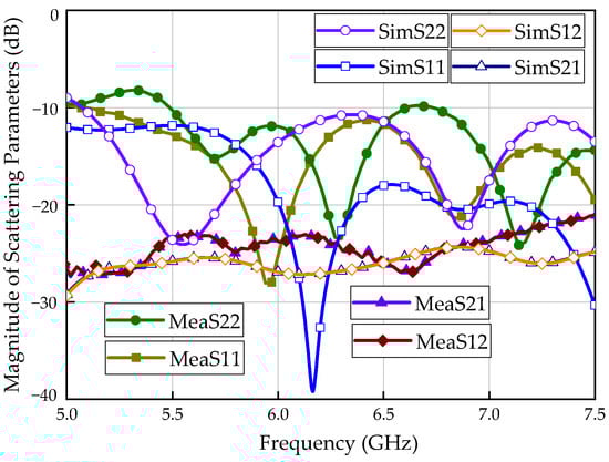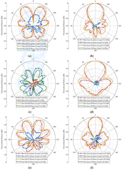 The radiation patterns at the 5.4 GHz, 6.45 GHz, and the 6.7 GHz are measured and compared with the simulated ones. The beams associated to the sum port show a maximum radiation in the endfire direction, having a front–back ratio of about 15 dB. The measured sum beam demonstrates a side lobe level of about −10 dB, and this may be further suppressed with the array factor in array designs. For the beams corresponding to the difference port, it can be inferred that the null is constantly in the endfire direction, and a stable null angle is important for the direction measurement and specification. The measured null depth at these three frequency points is all below −20 dB, which coincides with the measured sum and difference gain shown in Figure 13. Thus, the stable null direction and the large null depth facilitate the measurement of the incoming wave angle with high accuracy.