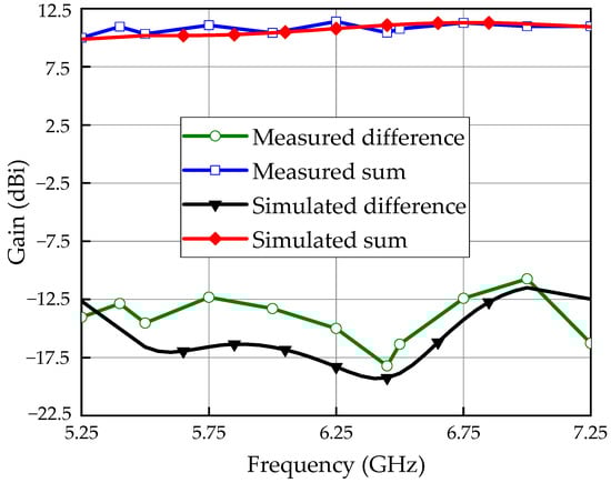 Gain of the antenna in the endfire direction is measured, and the results of the measured gain are demonstrated in Figure 12 along with the simulated ones. The measured results show the same trend of gain variation with the growth of frequency, which is also in good agreement with the simulated results. For the gain corresponding to the sum beam port, it shows a flat curve of about 10 dBi with a fluctuation less than 1 dB. In contrast to the sum beam, the gain for the difference beam port is lower than −11 dB in the frequency range from 5.25 GHz to 7.25 GHz. Consequently, a sum–difference ratio of 20 dB is obtained for the proposed monopulse antenna in the entire wide bandwidth.