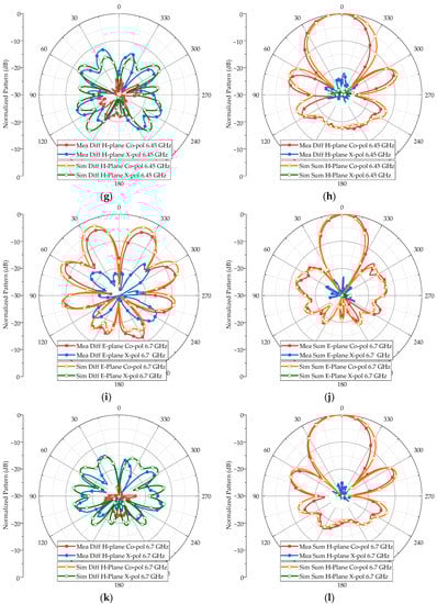 Simulated and measured normalized radiation patterns of co-polarization and cross-polarization. (a) E-plane pattern for the difference beam at 5.4 GHz, (b) E-plane pattern for the sum beam at 5.4 GHz, (c) H-plane pattern for the difference beam at 5.4 GHz, (d) H-plane pattern for the sum beam at 5.4 GHz, (e) E-plane pattern for the difference beam at 6.45 GHz, (f) E-plane pattern for the sum beam at 6.45 GHz, (g) H-plane pattern for the difference beam at 6.45 GHz, (h) H-plane pattern for the sum beam at 6.45 GHz, (i) E-plane pattern for the difference beam at 6.7 GHz, (j) E-plane pattern for the sum beam at 6.7 GHz, (k) H-plane pattern for the difference beam at 6.7 GHz, (l) H-plane pattern for the sum beam at 6.7 GHz.
