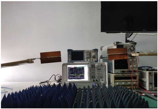 The difference beam of the proposed monopulse is characterized using the phase and magnitude difference over the operating band. The measurement setup is shown in Figure 14. Two antennas are installed with a distance of 1.0 m in the transmitting–receiving mode. The vector network analyzer is utilized for measuring the transmission coefficient between the two antennas. For the transmitting antenna, the sum port is excited, while the difference port is terminated with a match load. The difference port of the receiving antenna is connected to the VNA, and the sum port is matched to a 50-ohm load. For reducing the interference for the secondary reflection, absorbers are placed between the transmission path of the two antennas.