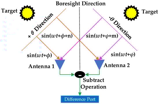 It is worth noting that the received signal at the sum port and the difference port originates from one and the same reflected signal. For the reflected signals from the targets appeared symmetrically on both sides of the boresight directions, they incident on the monopulse antenna in +θ and −θ directions, as shown in Figure 15. The corresponding difference signals can be expressed as follows