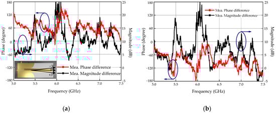 Measured magnitude difference and phase difference of transmission coefficient. (a) Magnitude difference of −3° to 0° and phase difference of 0° to 3°; (b) Magnitude difference of +3° to 0° and phase difference of 0° to +3°. Purple circles indicate the corresponding axes.