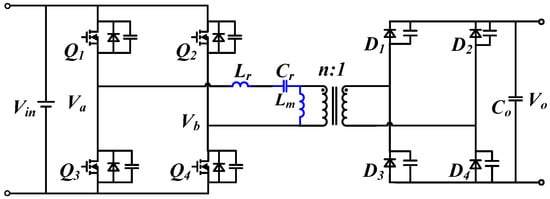 The DC (direct current) transformer is a necessary link for interconnecting DC networks of different voltage levels. It has been widely used in the field of new energy, fuel cells, supercapacitors, and where there are a DC bus and unidirectional transmission of energy in servers and communications [,]. To achieve high efficiency and high-power density DC transformers, many scholars have done a lot of research. Though the topology of the LCL (inductor–capacitor–inductor) resonant DC transformer is simple, it requires a large inductor on the DC side, which increases the cost, size, and weight of the converter. This type of DC transformer has no electrical isolation, which makes it easy to cause power reflow, and the probability of causing an electric shock accident is greatly increased. Therefore, more attention has been paid to DC transformers with electrical isolation. The dual active bridge (DAB) converter has a simple structure, can achieve soft switching (ZVS) characteristics, and energy flows in both directions [,]. However, its ZVS range is limited, and the switch also has a high turn-off current, resulting in a reduction in power conversion efficiency []. Even if the performance of the circuit can be improved by other modulation strategies, the complexity of the system control will increase accordingly []. The LLC resonant converter can achieve soft switching characteristics in the full load range and does not require complex control strategies [,]. Therefore, the research on the LLC converter has received extensive attention.