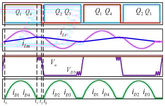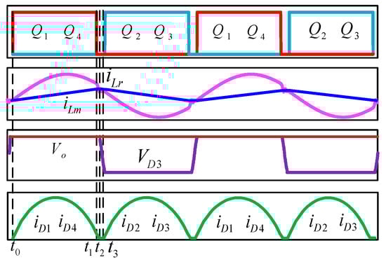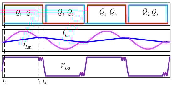 The main voltage and current waveforms of the LLC resonant converter for fs < fr (fs is the working frequency of switch, fr is the resonant frequency of LLC converter) are shown in Figure 2. At t1, the resonance current Ir and the excitation current Im start to be equal, the secondary diodes D1 and D4 have a current of 0, and zero current shutdown can be achieved. At t2, the primary switches Q1 and Q4 of the converter are turned off. During [t1–t2], the voltage across the excitation inductor is not clamped by the output voltage and the converter enters a three-element resonance state. As the current through the diode drops to zero, the D1 and D4 junction capacitors are charged, the D2 and D3 junction capacitors are discharged, and the capacitor of the output rectifier diode resonates with the resonant inductor Lr; the resonant current of the resonant circuit and the voltage across capacitor D3 oscillate. Detailed analysis of the oscillation process is given in Section 3 of this article. At the moment when the switches Q1 and Q4 are turned off, the diode voltage VD3 across the rectifier D3 is less than Vo; the equivalent circuit diagram of this period is shown in Figure 3. During [t2–t3], the voltage VD3 across the capacitor D3 drops rapidly. At t3, VD3 drops to 0, the resonance inductor and the excitation inductor start to be unequal, the secondary rectifiers D2 and D3 start to conduct, and the next cycle is started. It can be known from the above analysis that when fs < fr, the LLC resonant converter has two working modes during [t1–t3].