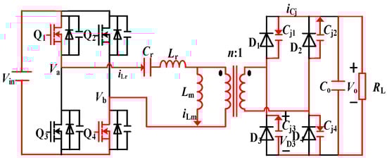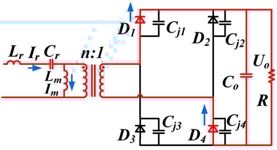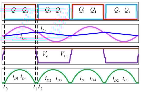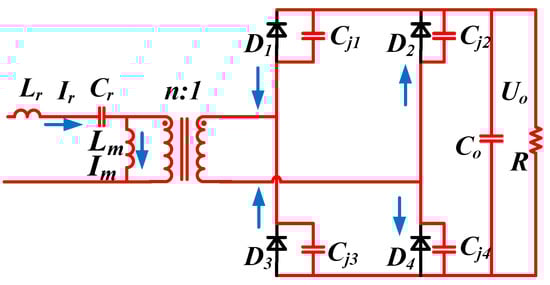 During [t1–t2], the primary switching transistors Q1 and Q4 are on state, and after the resonant tank current intersects with the magnetizing inductor current the carrying capacitor of the secondary rectifier diodes begins to charge and discharge and resonates with the primary resonant inductor. The specific operating mode is shown in Figure 8.