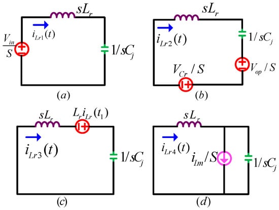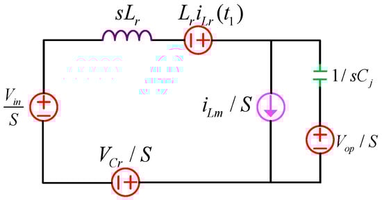 Since the resonant capacitor and the magnetizing inductor in the LLC resonant converter are relatively large, the [t1–t2] period is relatively short, so it can be considered that the resonant capacitor voltage and the magnetizing inductor current remain unchanged during [t1–t2]. Therefore, the resonant capacitor is equivalent to the voltage source Vcr, and the magnetizing inductor is equivalent to the current source iLm so that the equivalent circuit of the S domain during [t1–t2] can be obtained. The specific circuit is shown in Figure 9, where Cj1 = Cj2 = Cj3 = Cj4, Cj = Cj1/n2, Vop = nVo, where n is the turns ratio of the transformer.