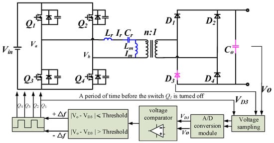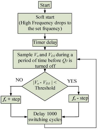 From the above analysis, when the primary switching transistors Q1 and Q4 are turned off, the magnitude of the output rectifier diode voltage VD3 reflects the working area of the LLC resonant converter. Therefore, the frequency tracking control can be performed by sampling the rectifier diode voltage. The control flow chart of frequency tracking is shown in Figure 11. In the actual implementation, the accuracy of the judgment is ensured by sampling the VD3 in a certain time interval before the switching off of the switch multiple times, thereby avoiding the condition that a single sampling point may be close to Vo to judge the problem of inaccuracy.