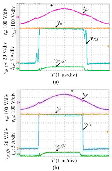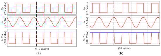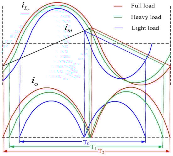 It can be known from Equation (12) that the effective value of the input voltage is only related to the input voltage Vin and keeps the output voltage unchanged, according to Equation (16). Due to power conservation, when the load is doubled, the input voltage remains constant, and the effective value of the resonant current doubles.