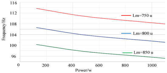 It can be known from Equation (22) that, when the parameters of the resonant converter are determined, the resonant period To increases as the load increases. The trend is shown in Figure 15. The relationship curve between power and resonance frequency is drawn in MATLAB as shown in Figure 16. From that figure, it can be concluded that the resonance frequency decreases as the load increases.