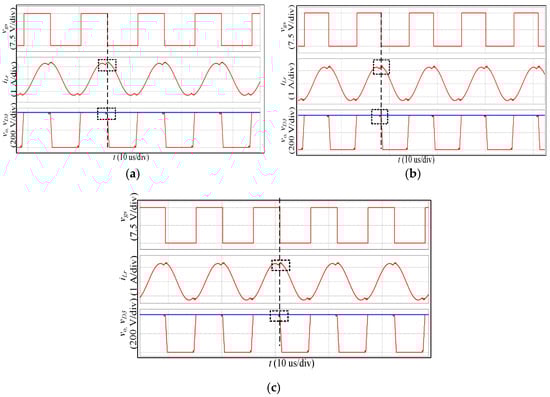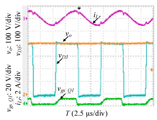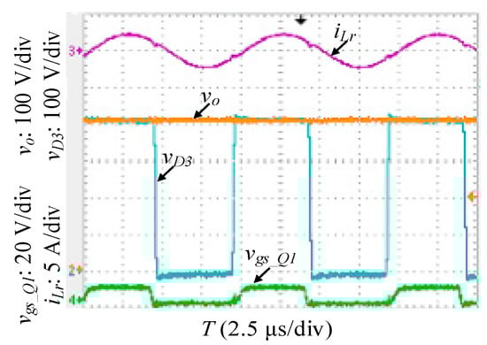 The working waveform of the full-bridge LLC resonant converter for when the converter works at the resonance frequency point is shown in Figure 13.