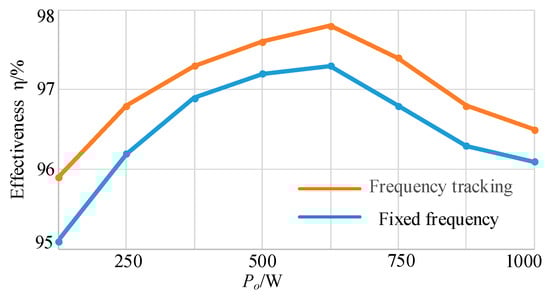 The actual work effectiveness calculation formula is shown above, where Io is the output current and Vo is the output voltage. The actual work effectiveness in this paper is obtained by measurement of the experimental platform using the power analyzer MAGTROL MODEL 6530 in the laboratory. It can be seen from Figure 24 that with the frequency tracking control strategy proposed in this paper, the LLC resonant converter can achieve higher energy transmission efficiency. Compared with the fixed switching frequency control strategy, the adaptive frequency tracking strategy can reduce the effective value of the resonant tank current, making the switching conduction loss smaller and the converter transmission efficiency higher. The frequency tracking points under different loads are shown in Table 3 below.