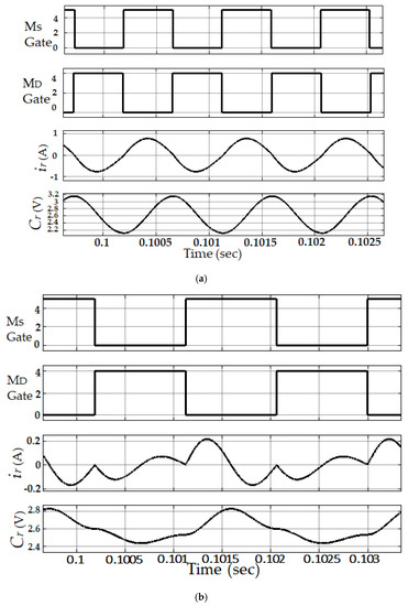 Figure 10a shows that the resonant capacitor voltage and current amplitude and wavelength are the same in each charging and discharging state with switching amplitude and wavelength, respectively. It meets the zero-voltage gap conditions. Figure 10B shows the enactment when the switching frequency value increases to double the resonant frequency than the waveforms. Suppose the resonant capacitor voltage and current wavelengths increase, and amplitude changes in each charge and discharge state with swathing amplitude and wavelength. The simulation analysis is consistent with experimental analysis. When the resonant inductor is 22 μH, and the resonant capacitor is about 100 μF, the switching frequency is 3.39 kHz, close to the resonant frequency, as shown in Figure 10c. The resonant capacitor voltage and current wavelength are smaller than Figure 10a. When the switching frequency is set equal to the resonant frequency, then the resonant tank’s current will be quasi-sinusoidal, as shown in Figure 10a,c. If the resonant frequency is small, then the balancing time is shorter because the resonant capacitor voltage wavelength became larger.