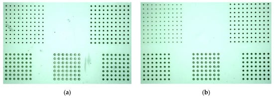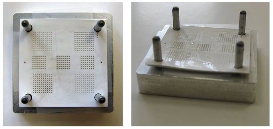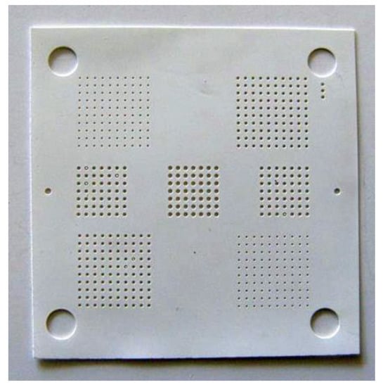 The LTCC tape used was the Ferro A6M-E tape [8] that has a relative permittivity of 5.7 and a loss tangent of less than 0.1% at 10 GHz. This tape is typically used to build millimeter-wave devices. As described earlier, the introduction of a hole pattern over the tapes may allow for the design of new devices. To aid this design, a fully developed fabrication process was required to ensure the specified hole shape and density. In [30] the dimensions for the hole diameter and the pitch were not reported. Also not included was the tape material, production method (including the use of SVM material and lamination method) or who fabricated the device. Here, the test substrate has been designed with different hole diameters keeping the pitch equal in all cases. Three 25.4 mm × 25.4 mm and 127 µm thick tapes were used to generate the test vehicles. The limited number of tapes was chosen in order to minimize cost while still providing information about lamination between layers and protection of the holes. A tape is shown in Figure 1. The holes were cut out by a micromachining tool equipped with a 1064 nm laser (LEM2 from Laser Cheval).
