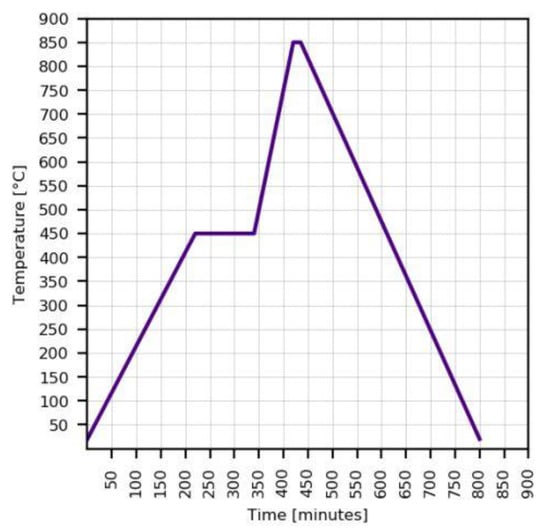 Thereafter, all six samples were fired simultaneously in a Nabertherm programmable static furnace using the standard firing profile reaching 850 °C for 15 min given by the manufacturer [35], however, the cooling is not forced which results in a slower course. The temperature profile is given in Figure 3.