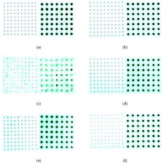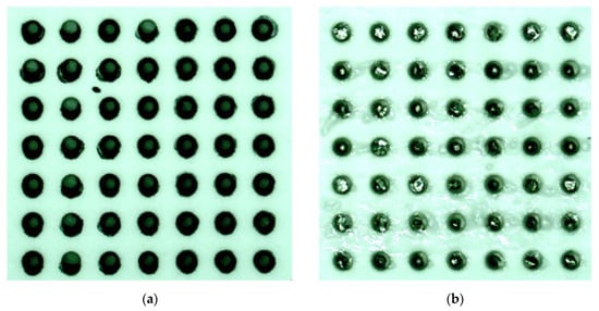 Images of the smallest and largest holes of the different samples are shown in Figure 6. The HEC 2 wt% sample has the least obstructed and best uniformity of the smallest holes. The HEC 5 wt%, gelatin and No SVM samples’ holes were smaller even though they have stayed circular and uniform—meaning that some degree of residue is present. The carbon paste sample shows holes with varying sizes (due to a varying fill ratio) and also a slight discoloration around the holes where the paste has been applied. For the agar-agar sample, the holes and the substrate surface had a large amount of residue present making the surface rough and, therefore, unacceptable.