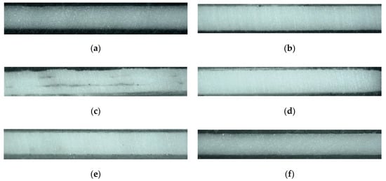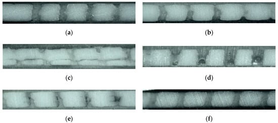 Cross-sections of the samples, after firing: (a) HEC 2 wt%, (b) HEC 5 wt%, (c) agar-agar, (d) gelatin, (e) carbon paste, and (f) no SVM. For all samples, except the agar-agar sample, lamination between layers is excellent.