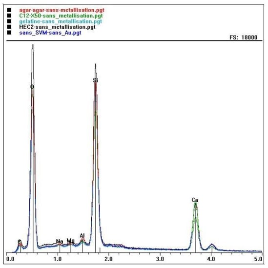 Energy-dispersive X-ray spectroscopy (EDX) spectrum for the different materials (except HEC 5 wt%). The plot colors indicate the materials as follows; HEC 2 wt% (black), agar-agar (red), gelatin (light blue), carbon paste (green) and no SVM (blue).