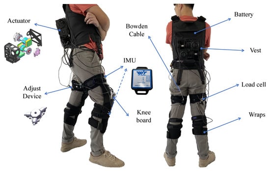 As shown in Figure 1, the entire drive module is fixed to the vest. The Bowden cable relates to the leg cover of each leg through the fixed point on the vest, which transmits the force from the motor system to the protective clothing. When the motor rotates inward, the distance between the connection points will be shortened, producing tension on the Bowden cable and acting on the whole protective clothing. Moreover, the initial length of the Bolton cable is adjustable for different wearers. IMU is used to collect real-time motion data of the wearer, such as angle, angular acceleration, and angular velocity. On each leg, two IMUs are respectively installed in the front of the thigh and shin. A load sensor is defined between the anchor cable and the anchor point to monitor force change in real time and return the force data to supply the microcontroller []. The exoskeleton consists of a nylon vest with a traction train, two belts wrapped around the test object, and two scaffolds (carbon fiber plate) which transmit traction torque to the knee and femoral joints.