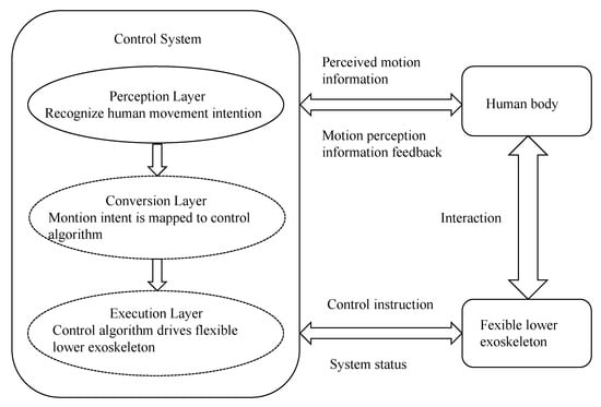 We use two driving modules ADM-15D80-CALT (ADM-15D80-CALT, Techservo, Shenzhen, China). Each driving module includes a brushless motor (MG-1/S 6010, DJI, Shenzhen, China). There are microprocessors (STM32F407, STMicroelectronics, Milano, Italy) that connect the microprocessor with the CAN communication protocol to process IMU and load sensor data, and send the command from the position required for the engine drive device. The system is supplied by a battery of lithium ions capable of 48V and 3ah. As shown in Figure 2, the control system is divided into three parts: perception layer, conversion layer and execution layer. The perception layer mainly receives signals from various mechanical sensors and identifies the human motion intention according to the intention recognition algorithm. In the conversion layer, a parameter optimal iterative learning control (POILC) method proposed by Chen et al. [] is adopted, which maps the generated motion intention into the corresponding force generation trajectory. Finally, the executive layer controls and drives the flexible exoskeleton according to the force generation trajectory. Therefore, in the control system of flexible lower limb exoskeleton, human motion intention recognition plays an important role.