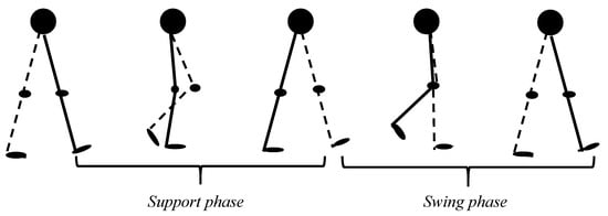 The lower limb movement of the human body has periodicity and regularity. Therefore, the cycle can be defined under flat conditions, starting from the foot impact of a foot to the end of the next foot of the same foot. []. Thus, the gait can be divided into support phase and swing phase (see Figure 3).