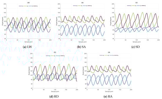 To solve severe delays in the flexible exoskeleton control, we also studied the conversion modes between the five topologies. Continuously moving on the same terrain is defined as steady-state model, and all five types of terrain mentioned above belong to the steady-state model. The motion mode from the initial terrain to another terrain is called the transition mode. The sliding window is used to extract the data corresponding to the steady-state mode, i.e., 100 data points are extracted from the toe off the ground. For the eight transition modes, several frame data are extracted from the conversion step. Figure 6 shows the angle signals of both legs’ sensors with eight transition modes.