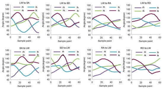 The changes in hip and knee joint angles in diverse terrain. LW (Level ground walking), SA (Stair ascent), SD (Stair descent), RA (Ramp ascent), RD (Ramp descent). rh (right hip), rk (right knee), lh (left hip) and lk (left knee).