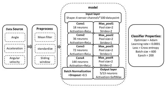 Since sensor activity data are recorded in time series, it is important to prepare training data according to the request for neural network convolution (CNN). In our proposed DNN-based deep location mode identification model(DDLMI), the data input includes four multi-dimensional channels, including an axis angle (x), two axes (XY) acceleration and two axes (YZ) angular velocity. Before transmitting to the network, we generally perform a series of preprocessing on the original data. Firstly, average filtering is performed for noise filtering, and then the data are normalized to eliminate the adverse effects of singular sampling data, and data is expanded by sliding window algorithm. Finally, data from parallel one-dimensional time series need to be reconstructed in the three-dimensional structure required by DDLMI, including the specific number of one-dimensional neurons, storing the number of memory steps to be processed for each time step and representing different sensor channels. For the architecture shown in Figure 7, we prepared a reformatted matrix of shape: No. of data rows × 100 samples/sequence × 20 features.