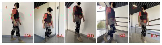 The testers wear a flexible lower-limb exoskeleton to test the continuous terrain motion recognition. (a) LW (Level ground walking), (b) SA (Stair ascent), (c) SD (Stair descent), (d) RA (Ramp ascent), (e) RD (Ramp descent).