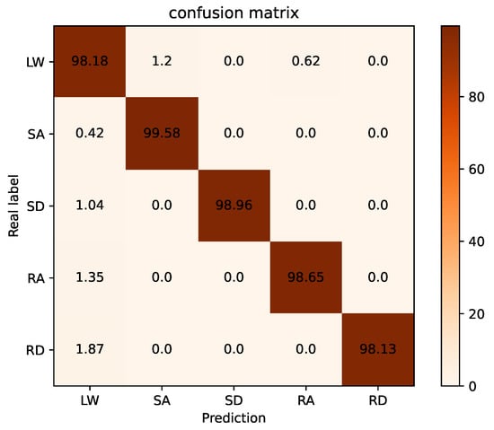 In the model training stage, the loss and accuracy of network training and verification can be obtained from Figure 9. After about 50 iterations, the loss functions of training and verification are infinitely close to zero, and the accuracy of both approaches 100%. This shows that the model has a good fitting effect. In the offline testing phase, the recognition accuracy of 7 subjects under different terrain conditions is shown in Table 1. The lowest recognition rate is 96.07%, and the highest is 100%. In the five terrains, ascending stairs and descending stairs have the best recognition rate. In these two cases, the hip and knee of both legs extend more widely, different from other terrains. The recognition of flat ground is the worst. The average classification rate of the five terrains is as high as 98.96%, which is in line with the actual requirements. Moreover, the five steady states confusion matrix is given in Figure 10. From the confusion matrix, it is not difficult to find that walking up and down the slope is easy to be confused with walking on the ground. The main reason is that walking upslope and walking downslope are similar, especially when the angle of slope is small. The second point is that on the initial uphill and downhill, the smaller the stride, the easier it is to be recognized as walking on flat ground. In addition, during the conversion, the last step is to walk on the ground, which may also be inaccurate. Generally speaking, the probability of confusion is within the acceptable range, which is in line with the actual situation, so the probability of correct identification is still satisfying.