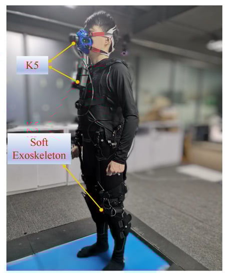 In the field of exoskeleton, net metabolic costs are often used to support its efficiency to evaluate. Six healthy adult males (24 ± 5 years old, 68 ± 8 kg weight, and 177 ± 6 cm height) participated in the experiment for metabolic rate. We conducted the experiment indoors at a speed of 4 km/h and temperature of 26 C. To measure the metabolism, concentration and volume of expired lung gas were measured using a gas analyser (COSMED K5, Rome, Italy) to record the concentration and volume of the exhaled pulmonary gas, which is mainly composed of carbon dioxide and oxygen. The metabolic rate can also be calculated using with Brockway equation modified []. For example, Equation (12).