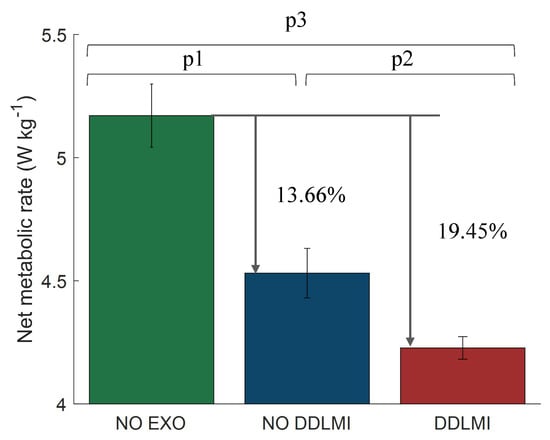 The metabolic reduction when walking on different terrains. The NO EXO, NO DDLMI, and DDLMI present the case of not wearing soft exoskeleton, and wearing exoskeleton with and without the DDLMI method. p1, p2, and p3 are the results of two-side t-tests, which are 0.0015, 0.009, and 0.0002, respectively.