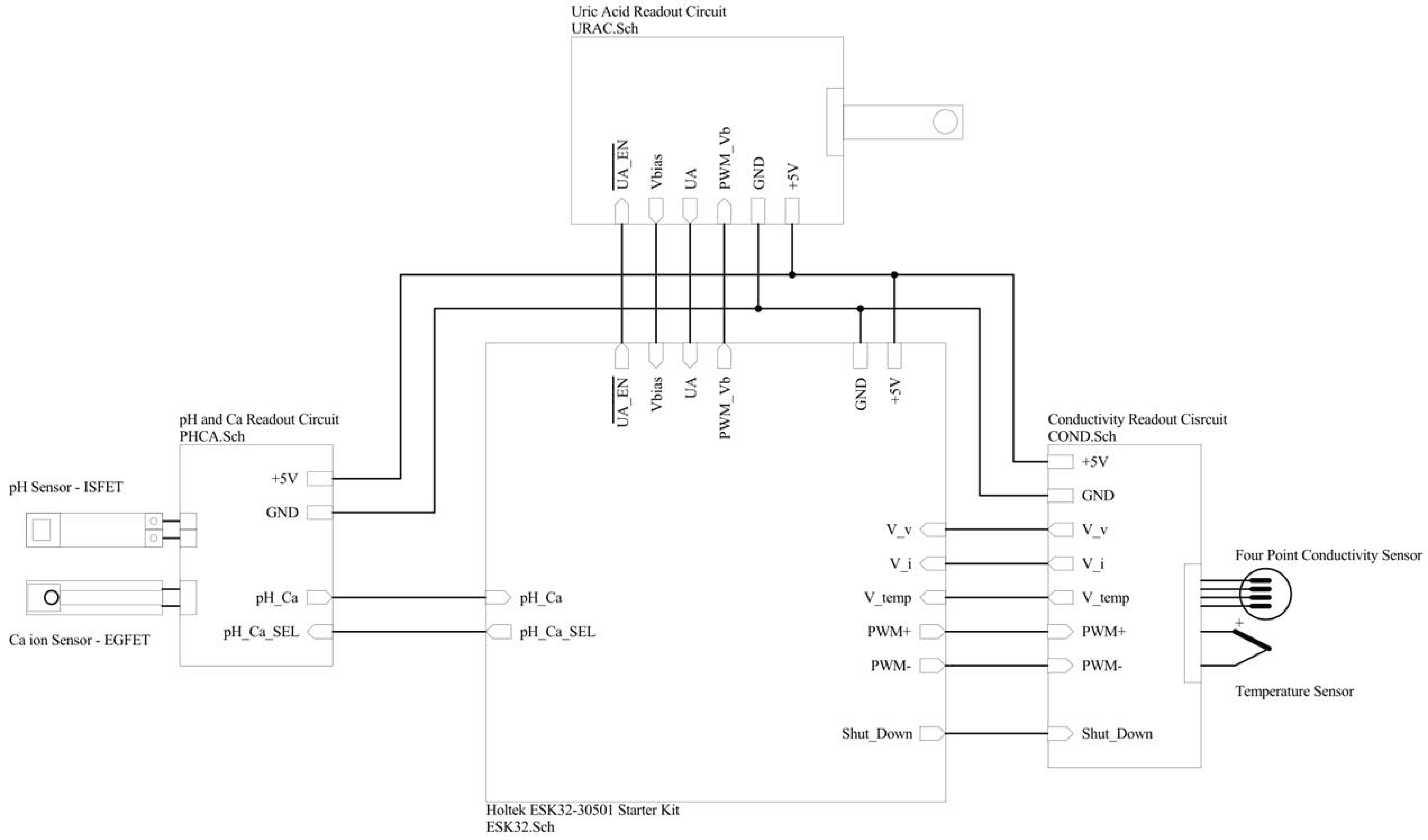 The readout circuits were the next layer of the system. The potentiometric readout circuit was connected to the pH and Ca2+ sensors via a selector relay. The uric acid level was measured by an amperometric readout circuit connected to an electrochemical cell. The conductivity sensor was connected to a multi-frequency conductometric readout circuit for the measurement of conductivity.