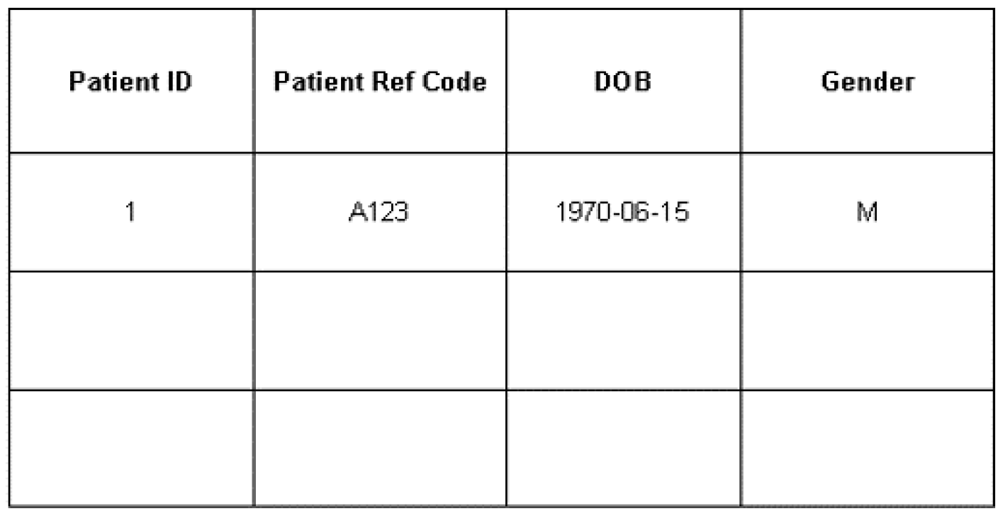 Due to legal requirements and ethical rules for the privacy of patients, storing patients’ personal data was not allowed. Each patient would be assigned a unique reference code by authorized personnel to hide their personal data. The patient reference code would be related to the patient ID in this table through a one-to-one relation. The patient ID served as the index and primary key of the patients table. The patients’ date of birth (DOB) and gender were also recoded in this table. Although DOB and gender were personal data of patient, since it was recorded anonymously, it would not violate the privacy of the patients. Figure 15 shows the structure of the patient table.